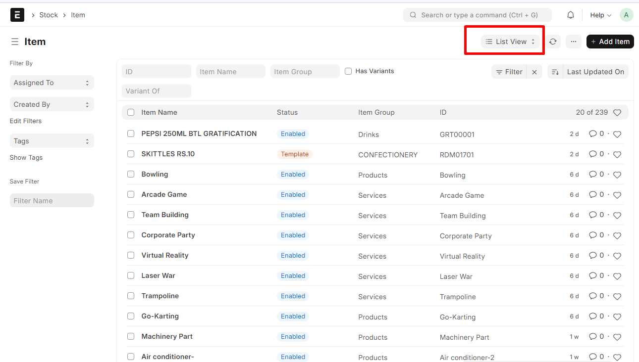 - In the List View, you’ll see the top 20 records with selected columns for the specific doctype.
