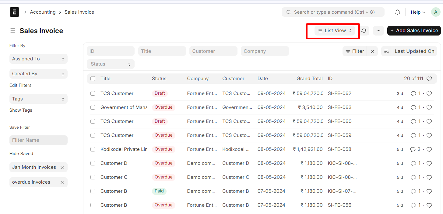 - For example, clicking on the date field will sort the data by the date field of invoices.